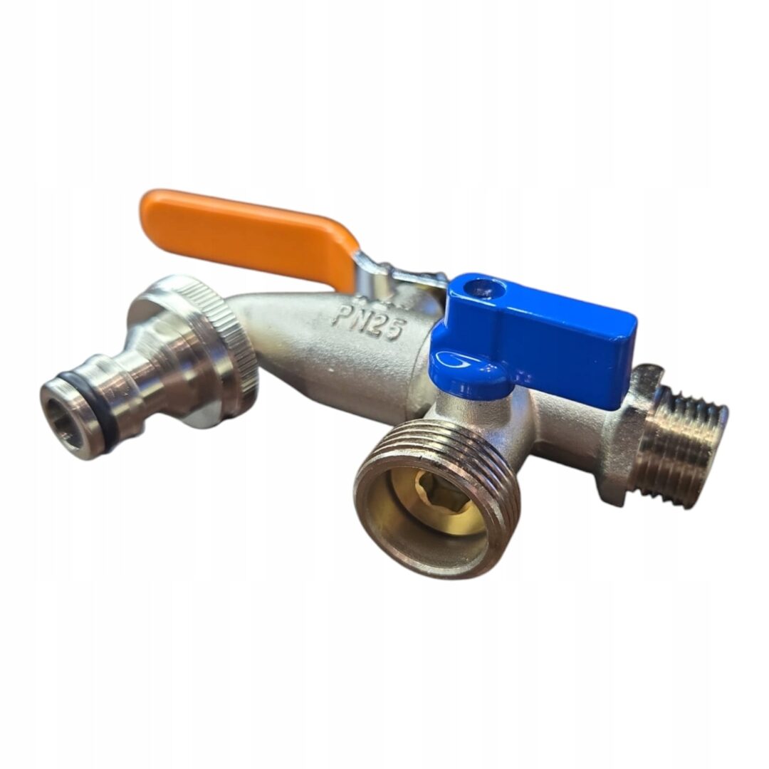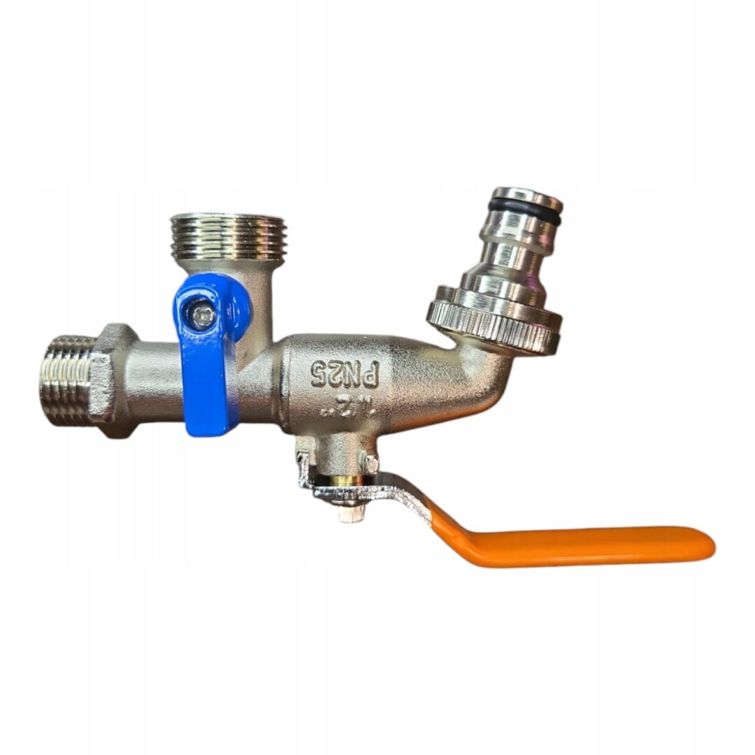 Kran Kulowy GZ 1/2″ z 2 Wyjściami GZ 3/4″ + Nypel do Szybkozłączki | Mosiądz Niklowany