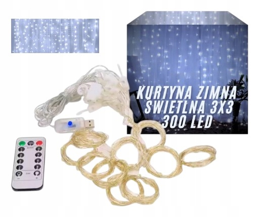 KURTYNA ŚWIETLNA LED 3x3m ZIMNA BIEL USB 300 LED girlanda na okno PILOT
