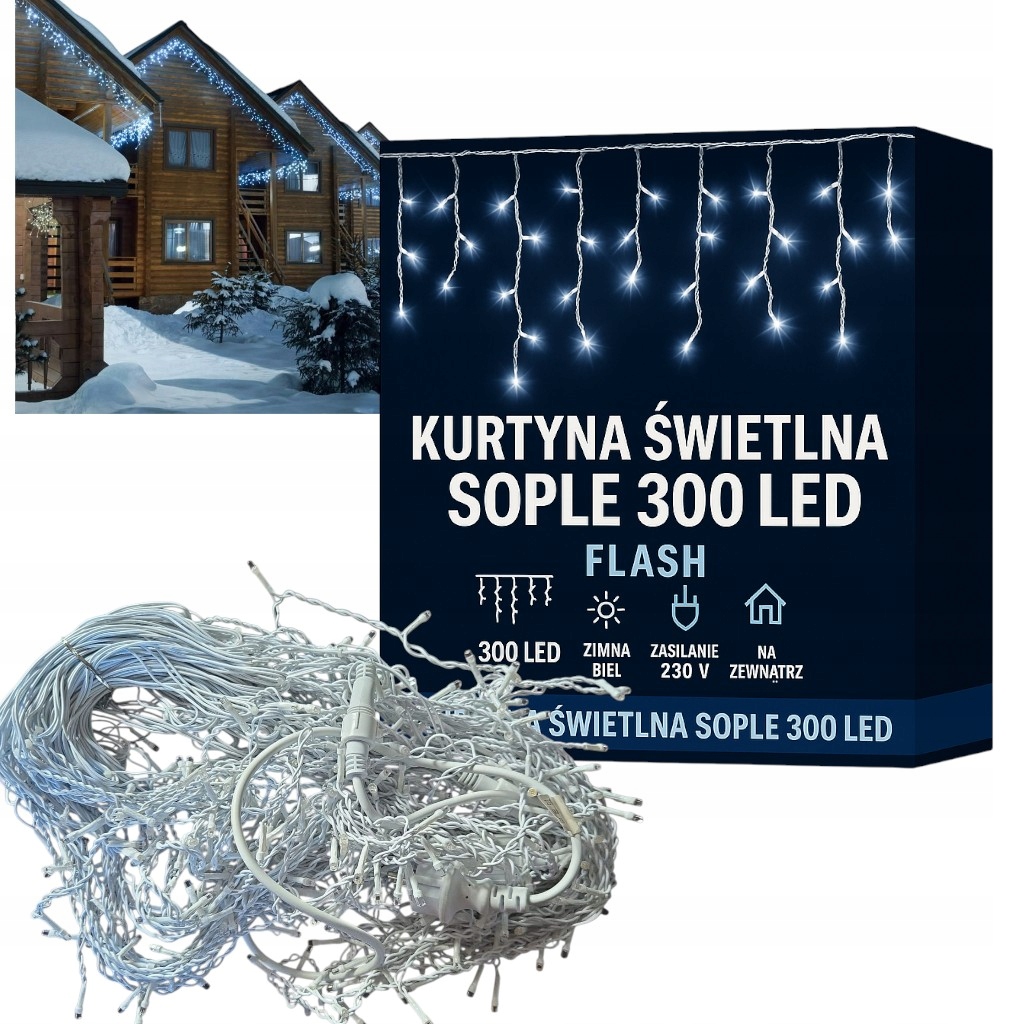 SOPLE 300 LED kurtyna świetlna BIAŁE ZIMNE 12m GIRLANDA zewnętrzna FLASH