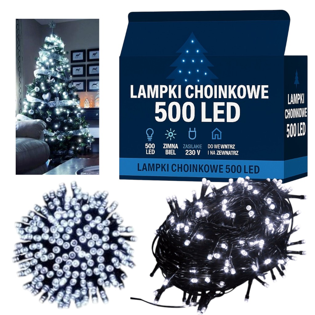 Nadaj swoim świętom wyjątkowego blasku dzięki naszym lampkom choinkowym. Dokładnie 500 prawdziwych (a nie 476) diod LED o barwie zimnej bieli rozświetli Twój dom eleganckim, śnieżnym światłem, tworząc magiczną atmosferę.