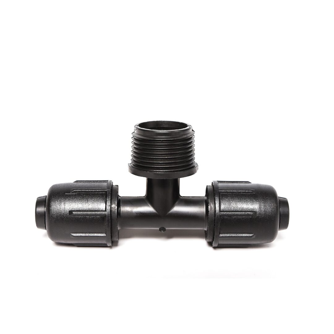 Trójnik szybkozłączny QJ 16-1/2M-16 to niezawodne rozwiązanie do montażu z linią kroplującą i rurami PE o średnicy 16 mm, zapewniając idealne dopasowanie do innych elementów instalacji systemu nawadniającego z gwintem 1/2 cala.